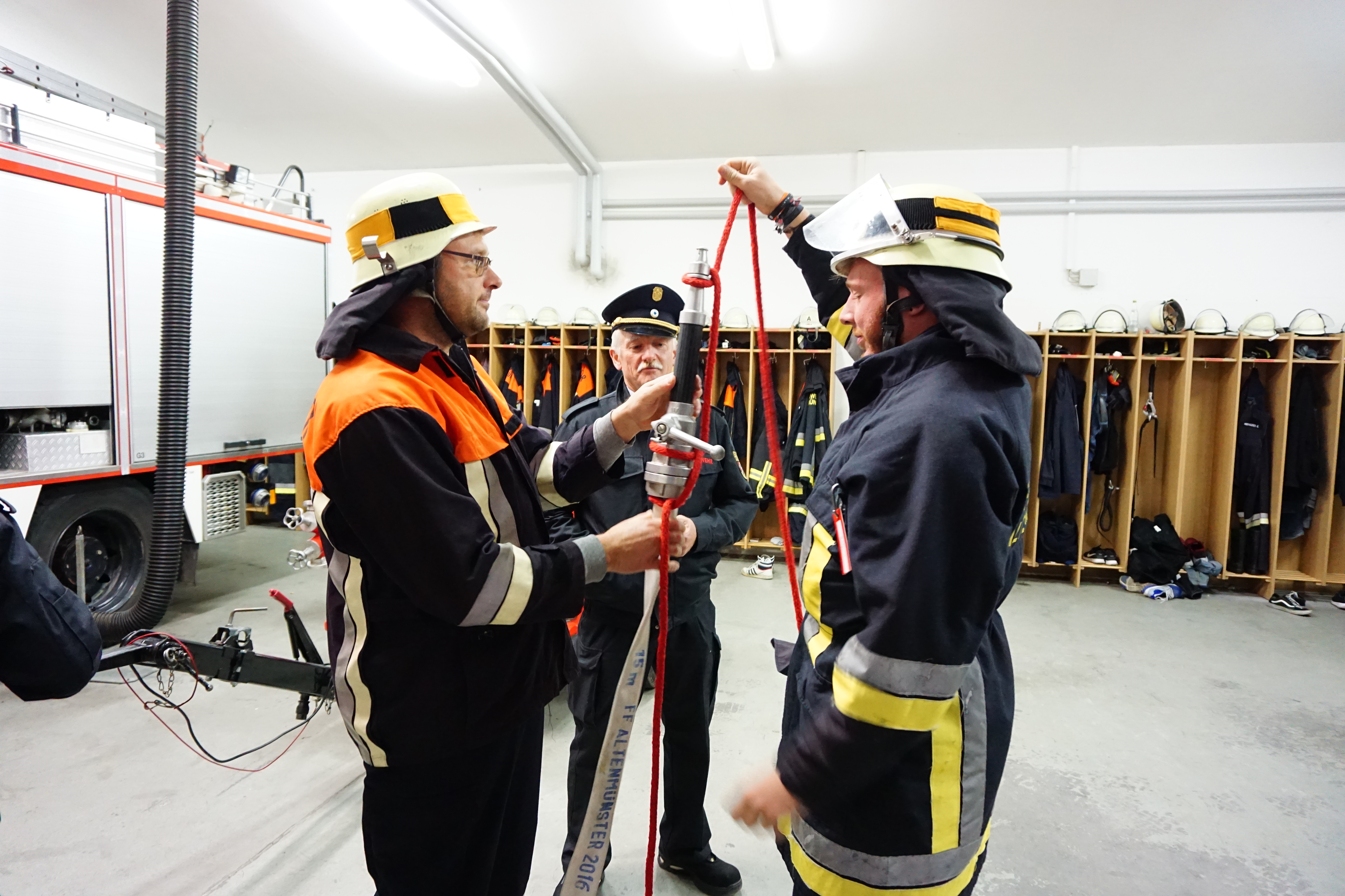 In drei Gruppen mussten die Aktiven Ihr Können bei der Übung „Die Gruppe im Löscheinsatz“ in verschiedenen Schwierigkeitsstufen unter Beweis stellen. Theoretische Fragen zur Fahrzeugkunde und Erste Hilfe oder das Erkennen von Gefahrenzeichen, zählen ebenso zu den Aufgaben wie das richtige Anlegen von „Knoten und Stichen“. In einer vorgegebenen Zeit von 190 Sekunden mussten die Gruppen anschließend einen Löscheinsatz simulieren und das Kuppeln der Saugleitung innerhalb 100 Sekunden absolvieren.